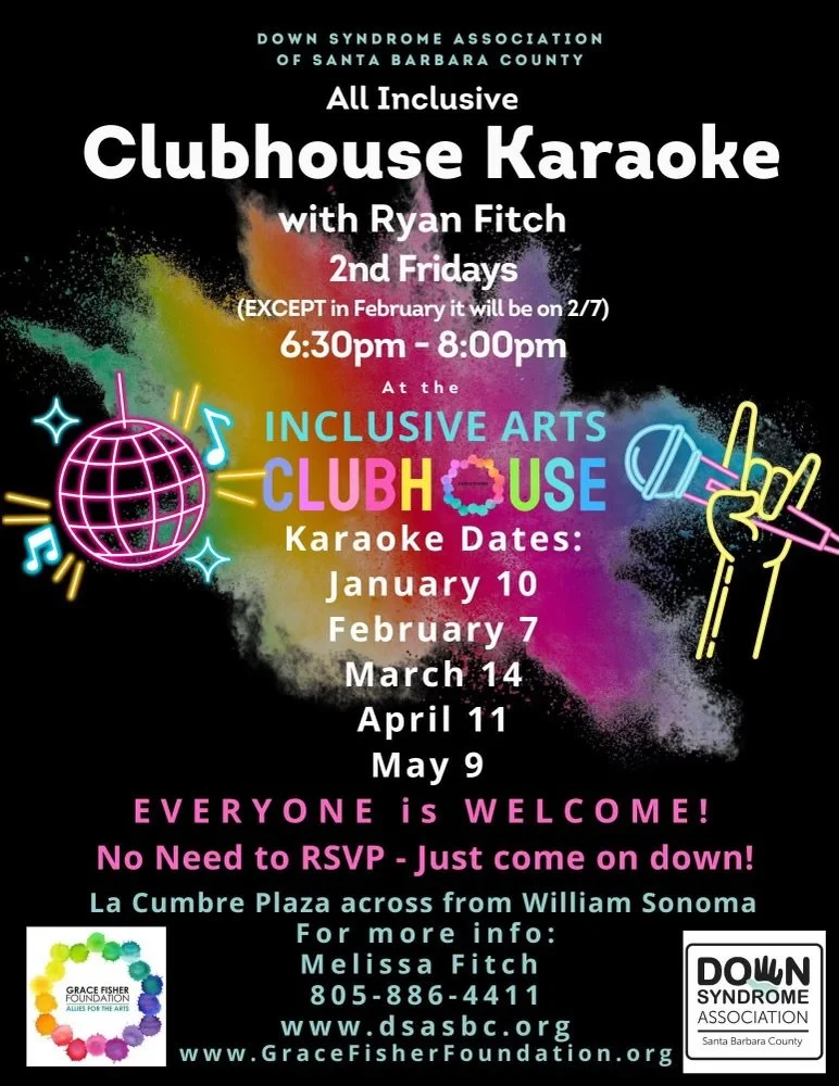 Clubhouse Karaoke! Friday, March 14, 2025 6:30 PM 8:00 PM Grace Fisher Foundation Inclusive Arts Clubhouse 120 South Hope Avenue Santa Barbara, CA, 93105 United States (map) Google Calendar ICS