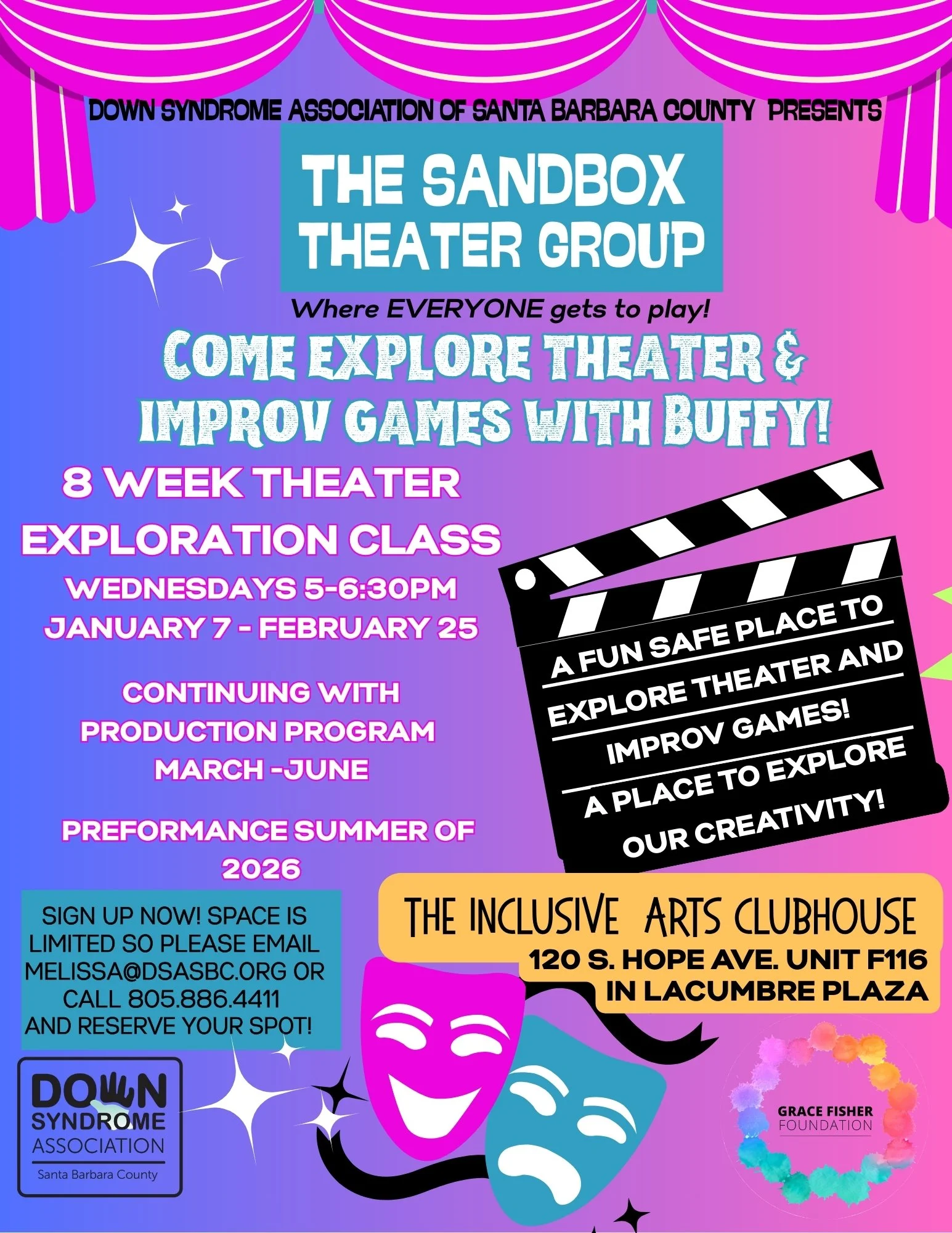 Sandbox Theater Group Wednesday, February 11, 2026 5:00 PM 6:30 PM Grace Fisher Foundation Inclusive Arts Clubhouse 120 South Hope Avenue Santa Barbara, CA, 93105 United States (map) Google Calendar ICS