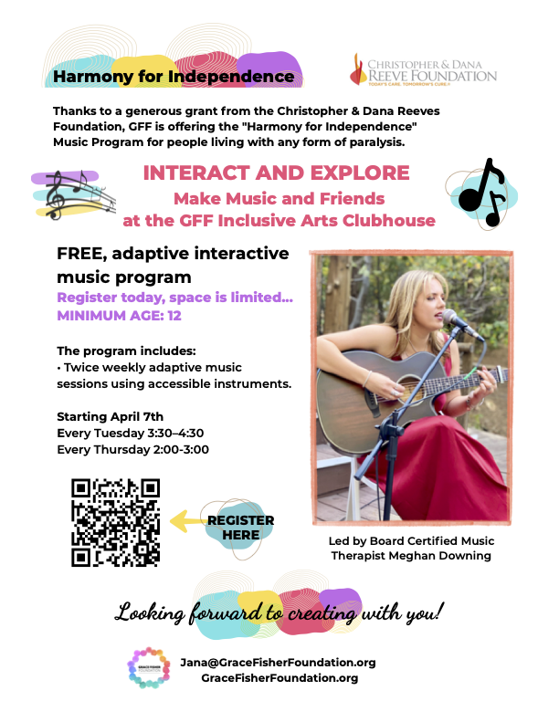 Back to All Events Harmony For Independence: Music Program Tuesday, April 7, 2026 3:30 PM 4:30 PM Grace Fisher Foundation Inclusive Arts Clubhouse 120 South Hope Avenue Santa Barbara, CA, 93105 United States (map) Google Calendar ICS sign up