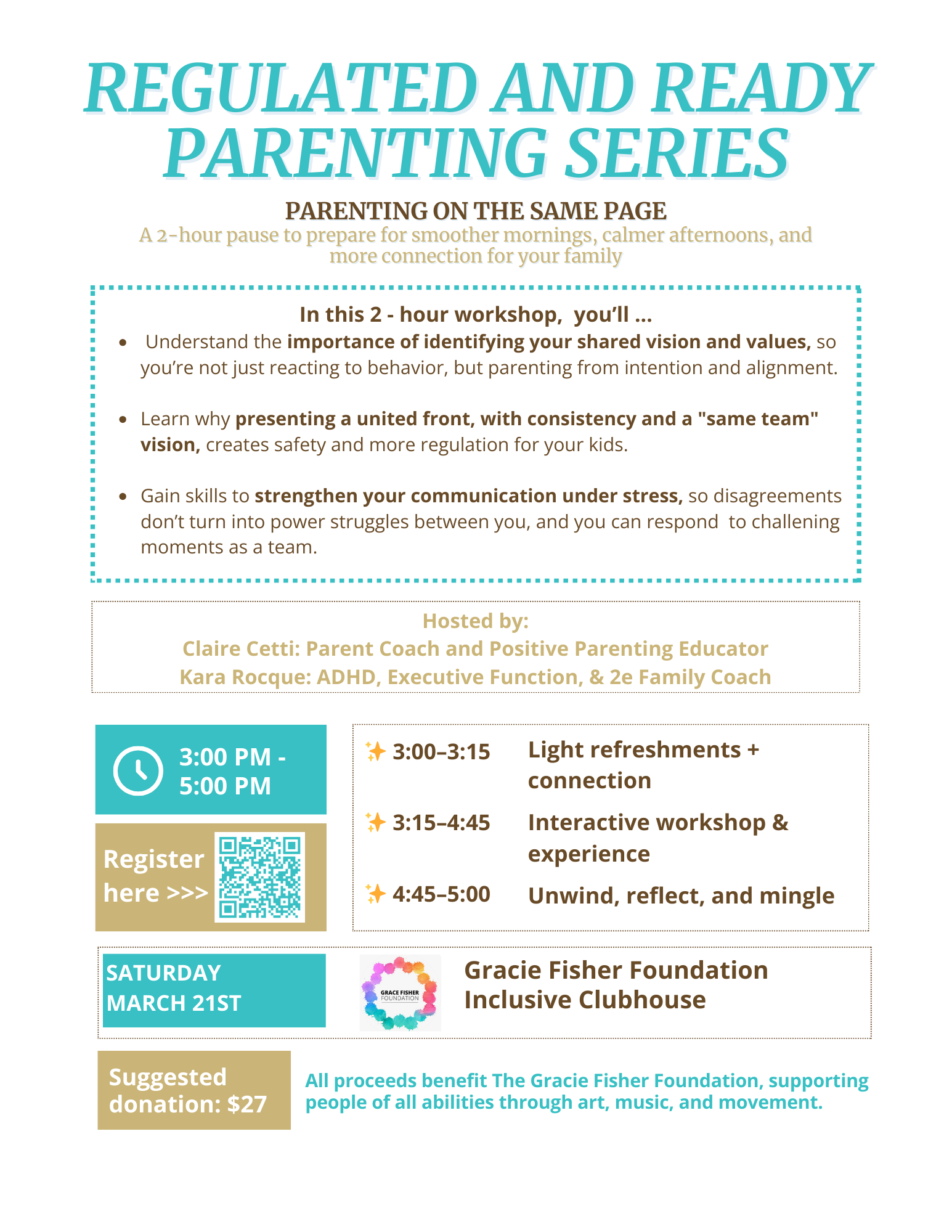 Parent Workshop: Regulated and Ready Parenting Series Saturday, March 21, 2026 3:00 PM 5:00 PM Grace Fisher Foundation Inclusive Arts Clubhouse 120 South Hope Avenue Santa Barbara, CA, 93105 United States (map) Google Calendar ICS