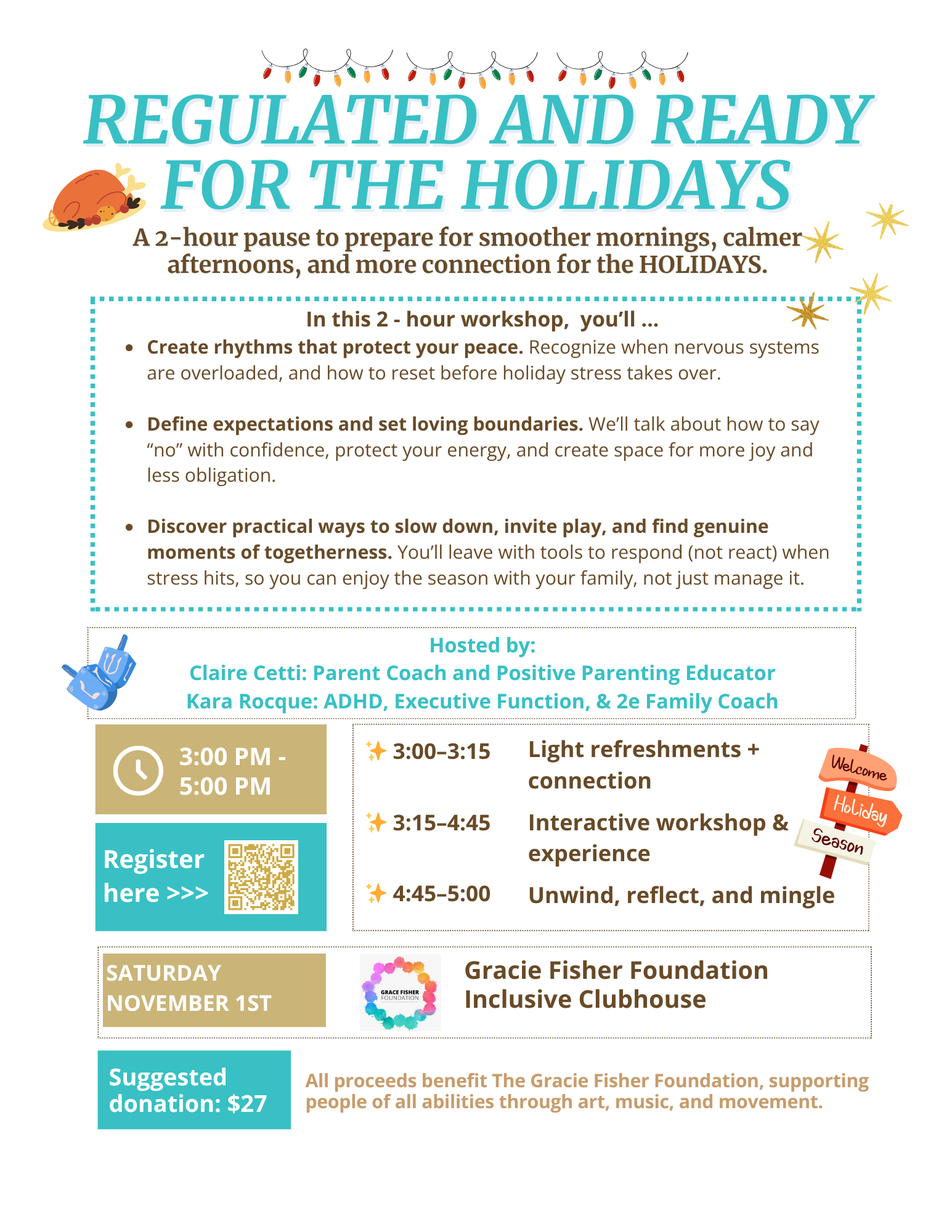 Regulated and Ready For The Holidays Saturday, November 1, 2025 3:00 PM 5:00 PM Grace Fisher Foudnation Inclusive Arts Clubhouse 120 South Hope Avenue Santa Barbara, CA, 93105 United States (map) Google Calendar ICS