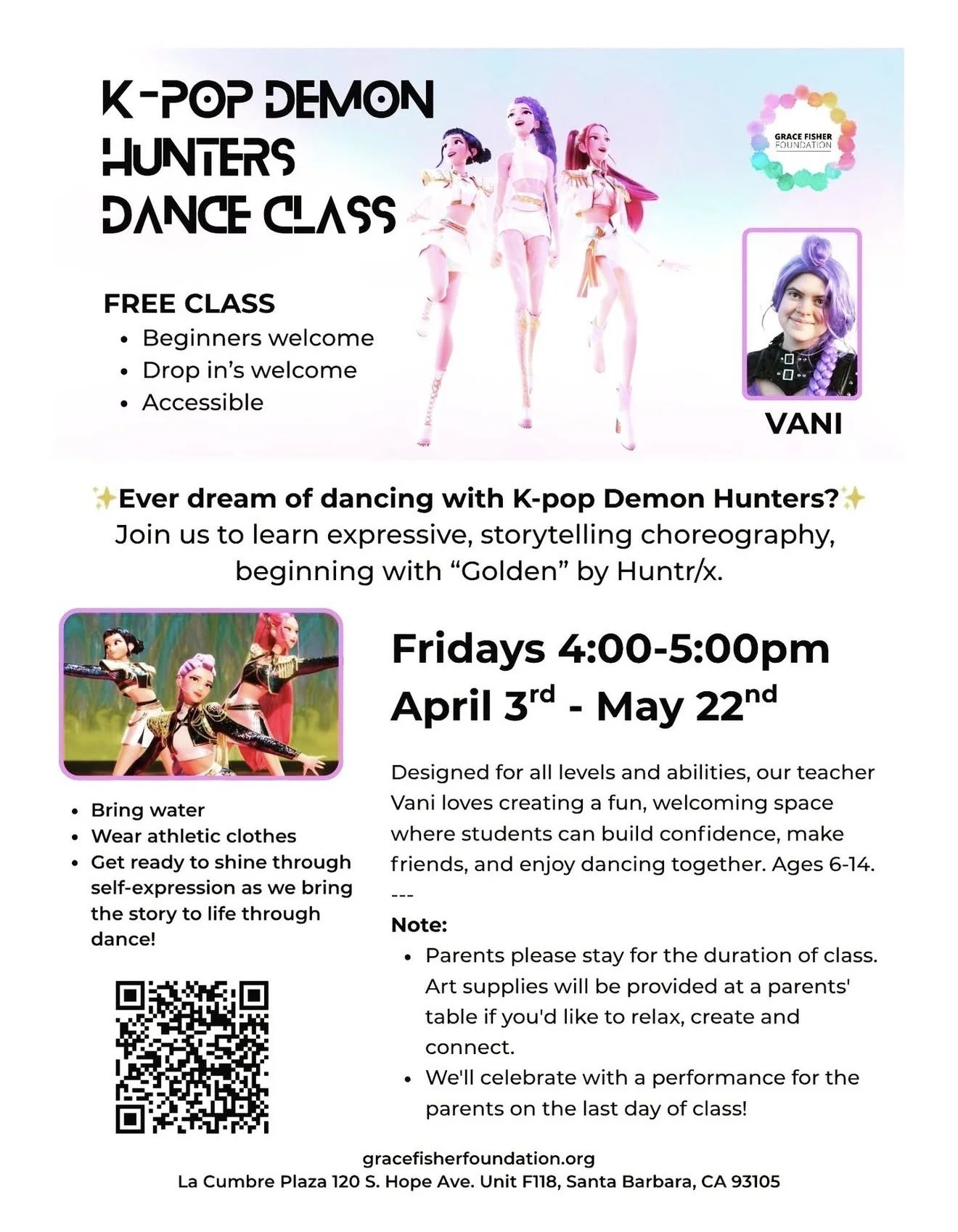 Join our K-Pop Demon Hunters Dance Class, where students ages 6–14 learn expressive, storytelling choreography inspired by the energy and style of K-pop. Led by Vani Winick, this welcoming class focuses on building confidence, creativity, and connection through movement.